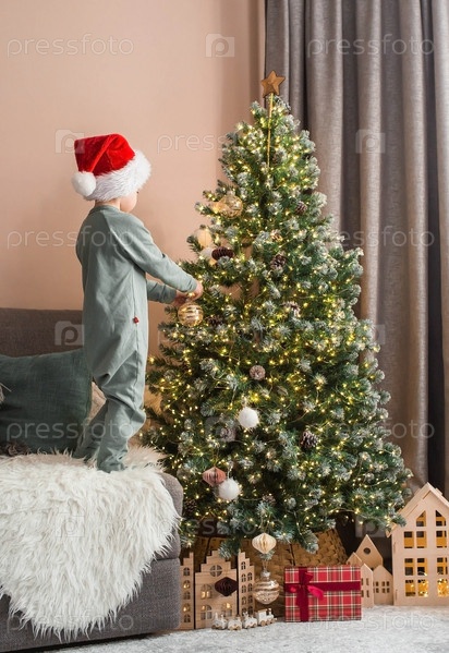 Красивый маленький мальчик 4 лет в шапке Санта-Клауса украшает елку в гостиной. Сочельник. Концепция празднования Рождества и Нового 2024 года