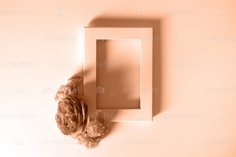 Цвет 2024 года — персиковый фузз. Цветочная рамка из розовых цветов на белом или розовом фоне. Плоская планировка, вид сверху. Концепция весны и лета. Дизайн рамы с головками ромашковых роз. Пустое место. Шаблон для романтической открытки