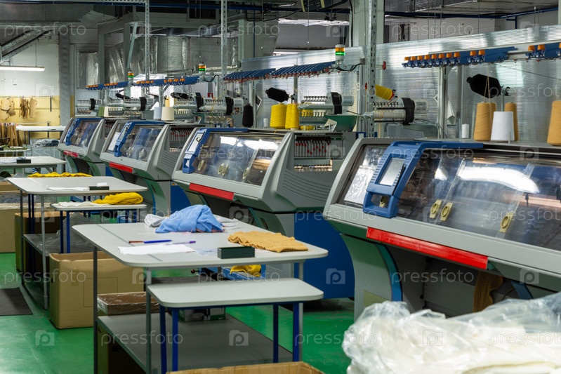 Ряд промышленных текстильных плосковязальных машин на трикотажной фабрике