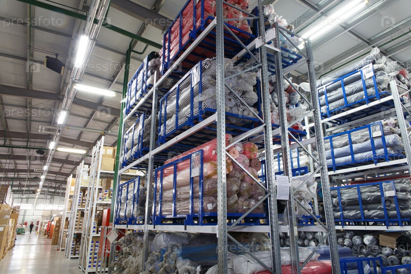 Обзор большого промышленного современного склада, хранящего продукцию в картонных коробках, мешках и рулонах