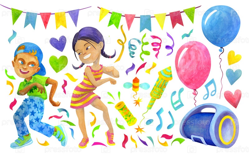 Набор предметов и персонажей для декора детского праздника с танцующими детьми, гирляндами из флагов, конфетти, серпантином, нотами, фейерверками, воздушными шарами, сердечками, музыкальным устройством