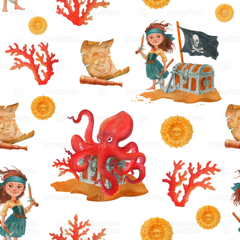 Бесшовный паттерн с девочкой-пиратом, осьминогом, кораллами и пиратскими элементами. Акварельный орнамент для дизайна текстиля, обоев, упаковки