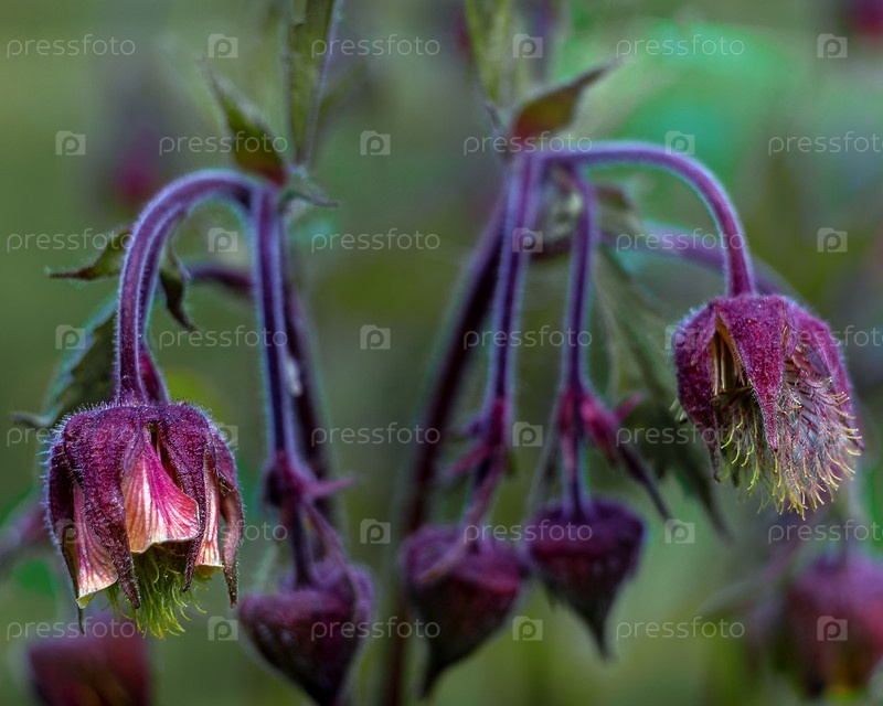 Два цветка гравилата речного сфотографированы крупным планом. Цветы расположены по краям картины. На заднем плане в нерезкости видны стебель и листья цветка