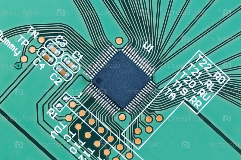 Микропроцессор на зеленой печатной плате крупным планом, вид сверху. Макрофотография