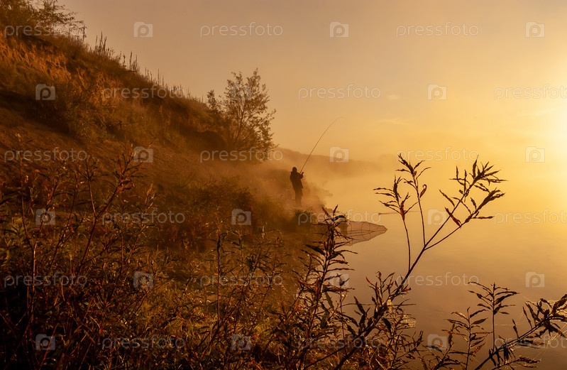 Рыбак с удочкой на берегу реки в тумане, солнце окрашивает берег и воду. Река Ока, Рязанская область