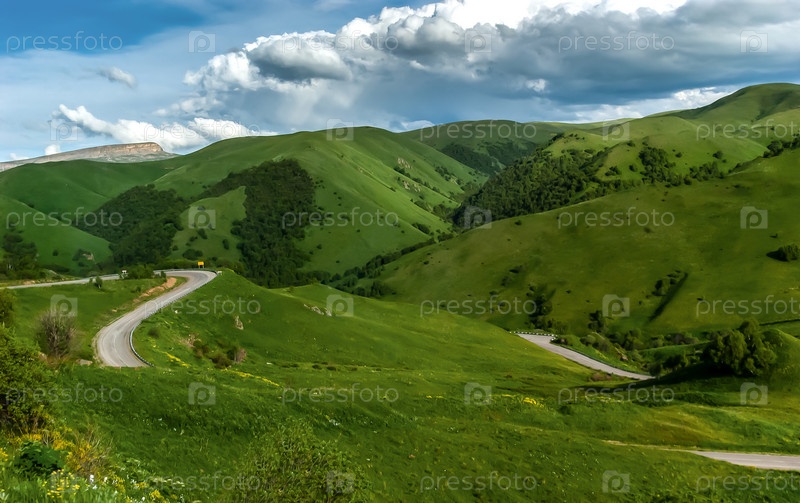 Бесконечные зеленые холмы, среди которых вьется дорога, облака, перевал Гум-Баши вид со стороны Аула Верхняя Мара. Карачаево-Черкессия, Россия