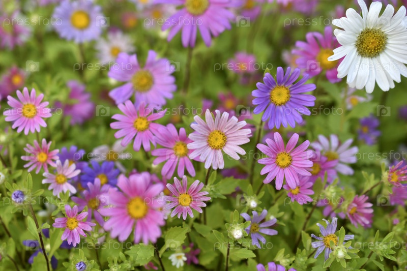 Ковер из разноцветных цветов. Бледно-розовые цветы астры на клумбе. Много красивых цветов