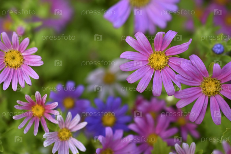 Ковер из разноцветных цветов. Бледно-розовые цветы астры на клумбе. Много красивых цветов