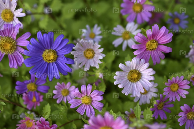 Ковер из разноцветных цветов. Бледно-розовые цветы комеи на клумбе. Много красивых цветов