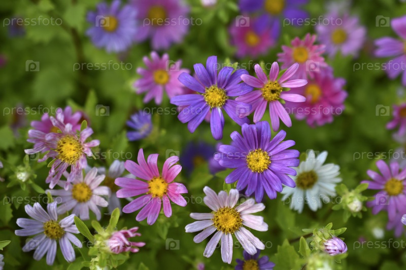 Ковер из разноцветных цветов. Бледно-розовые цветы астры на клумбе. Много красивых цветов