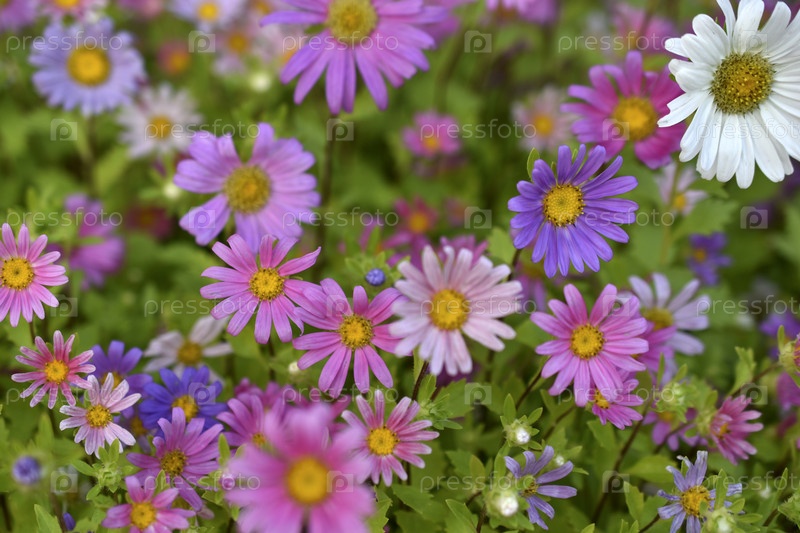 Ковер из разноцветных цветов. Бледно-розовые цветы астры на клумбе. Много красивых цветов