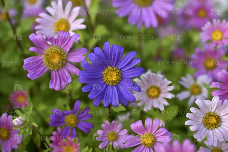Ковер из разноцветных цветов. Бледно-розовые цветы астры на клумбе. Много красивых цветов