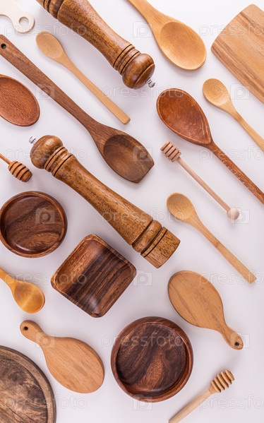 Различные виды кухонной утвари из экологически чистых деревянных материалов на белом фоне. Плоская параллельная укладка. Вертикальный вид. крышка. макет