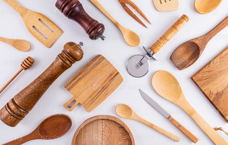 Множество различных деревянных кухонных инструментов для приготовления пищи на белом фоне. Вид сверху. Плоская планировка. Эко предметы. ноль отходов