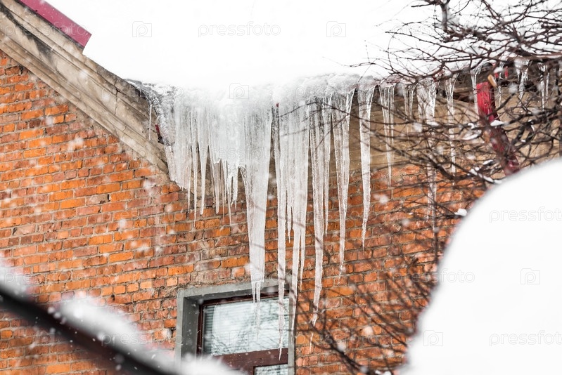 Осторожно. Опасность. С карниза крыши свисают красивые острые сосульки и снег. Прозрачные сосульки скользят по крыше