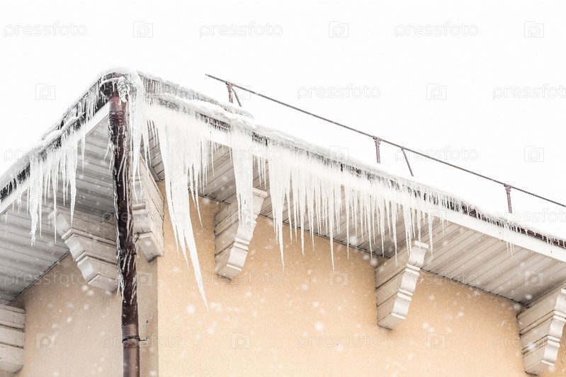 Осторожно. Опасность. С карниза крыши свисают красивые острые сосульки и снег. Прозрачные сосульки скользят по крыше