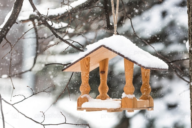 Зима. Падает снег. На ветке дерева в парке висит деревянная кормушка для птиц. Кормление птиц в суровые и холодные дни. Красивый рассеянный свет