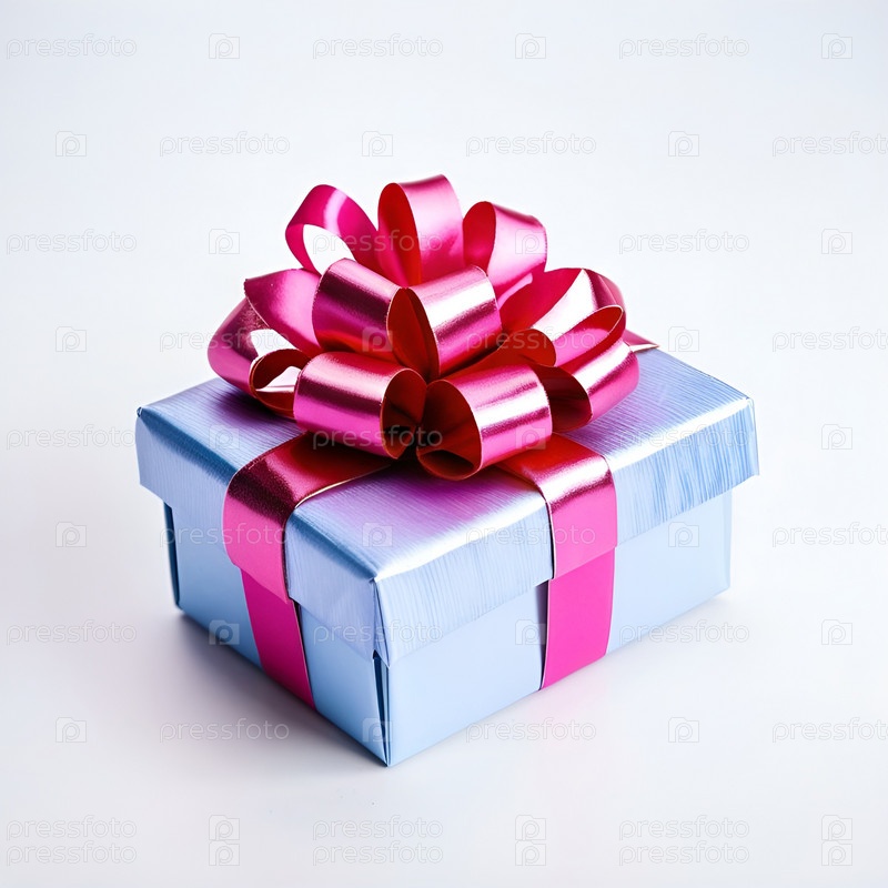 Синяя подарочная коробка с розовым бантом на белом фоне