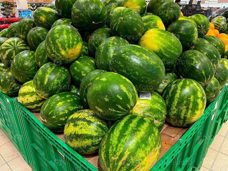 Арбузы на прилавке супермаркета, сезонная доставка арбузов