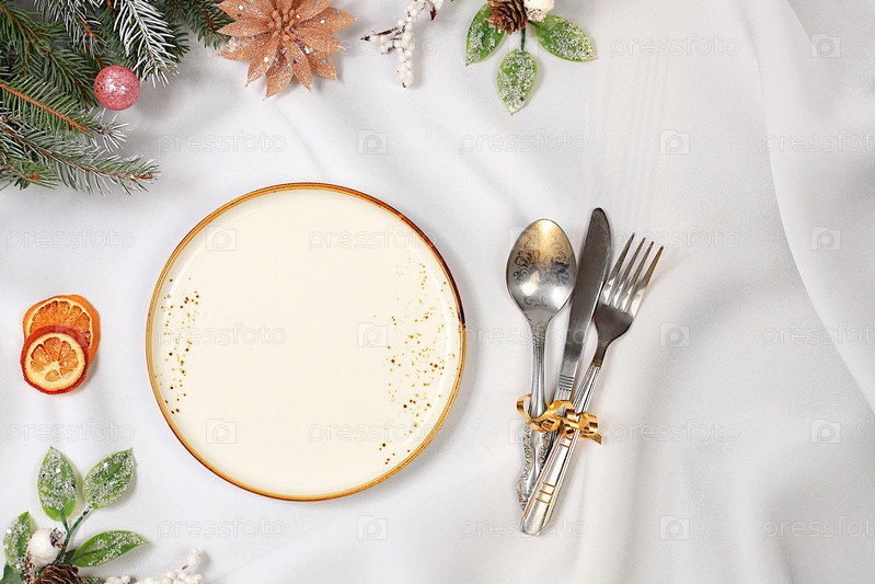 Рождественская сервировка стола, макет праздничного меню, новогодние столовые приборы с тарелкой на мраморном бетонном фоне, праздничная композиция с еловыми ветками, кухонный фон. Селективный фокус