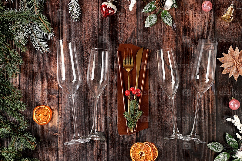 Рождественская сервировка стола, макет праздничного меню, новогодние столовые приборы с пустыми бокалами шампанского на деревянном фоне, праздничная композиция с еловыми ветками, кухонный фон