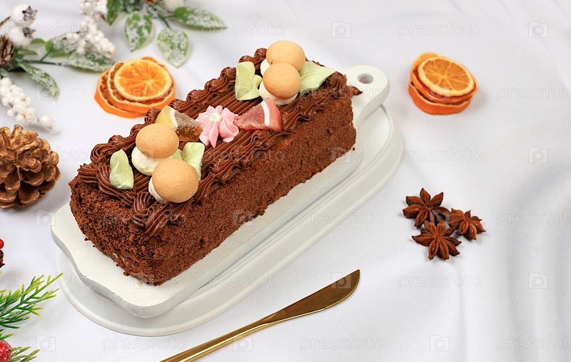 Домашний зимний десерт, штоллен или штрудель со сладко-сливочной начинкой, орехами, корицей и маком. Концепция праздничной выпечки, сезонных угощений и рекламы кафе,