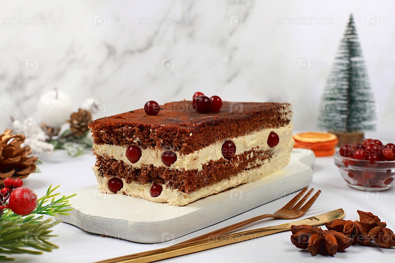 Домашний зимний десерт, тирамису со сладко-сливочной начинкой, орехами, корицей и клюквой. Концепция праздничной выпечки, сезонных угощений и рекламы кафе,