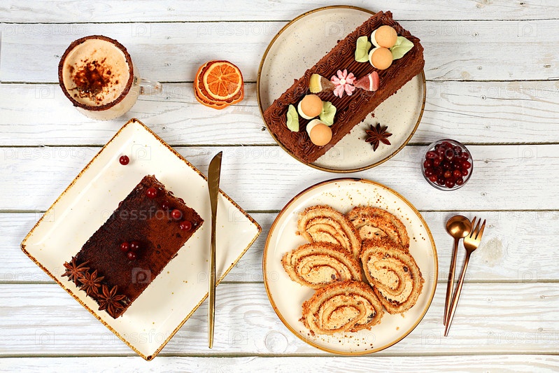 Домашний десерт, штоллен или штрудель со сладко-сливочной начинкой, орехами, корицей и гоголь-моголем. Концепция праздничной выпечки, сезонных угощений и рекламы кафе