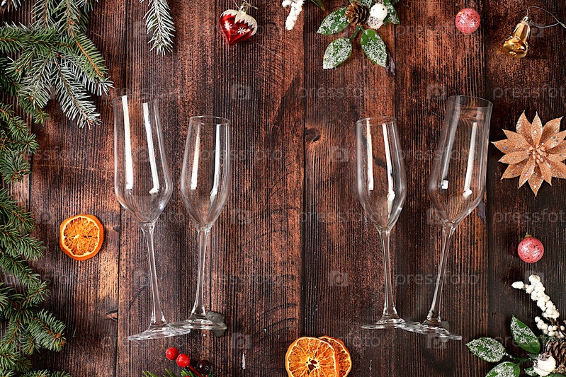 Рождественская сервировка стола, макет праздничного меню, новогодние столовые приборы с пустыми бокалами шампанского на деревянном фоне, праздничная композиция с еловыми ветками, кухонный фон