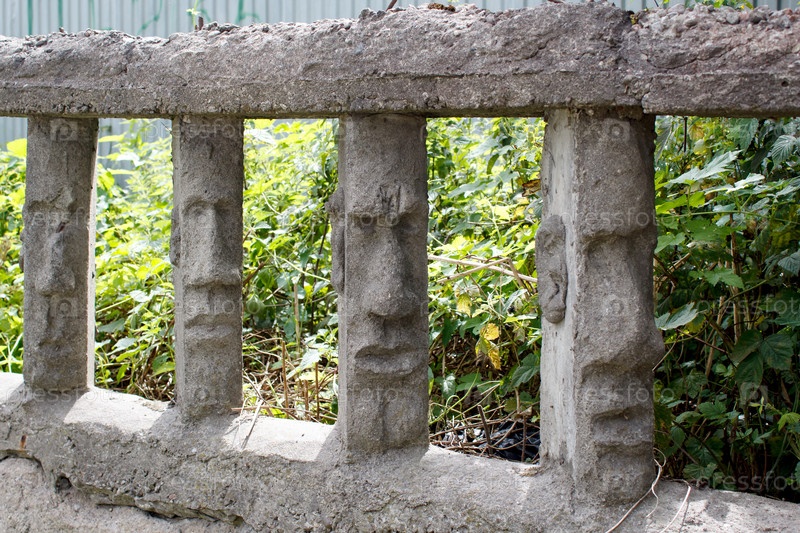Каменный забор с человеческими лицами в солнечный летний день