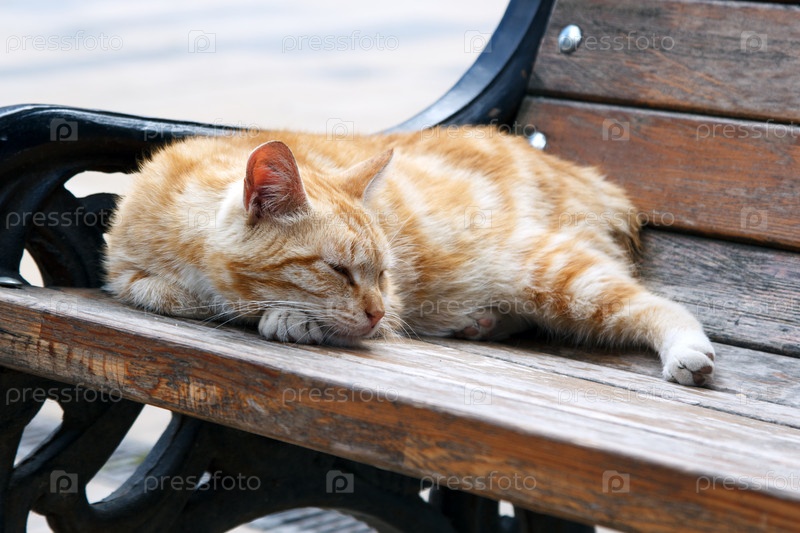 Кот лежит на скамейке в парке в солнечный летний день
