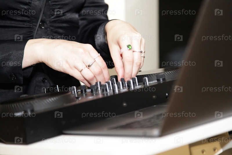 Руки девушки-диджея за консолью в ночном клубе крупным планом