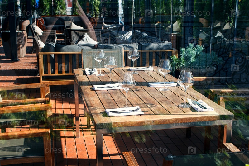 Стол с очками в городском уличном кафе в солнечный летний день