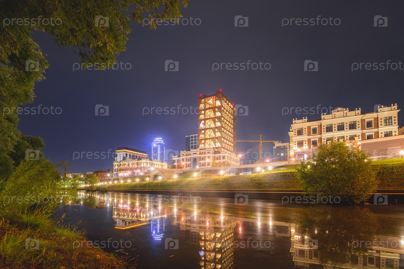 Достопримечательности екатеринбургской набережной отражаются в реке Исеть ночью