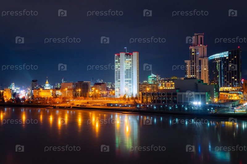 Центр города Екатеринбурга отражается в замерзшем городском пруду ночью