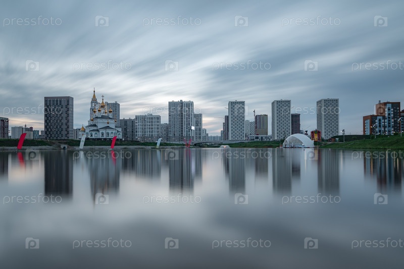Академический район Екатеринбурга отражается в Преображенском пруду на закате