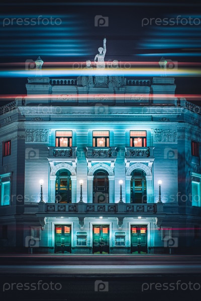 Огни проезжающих машин перед екатеринбургским театром оперы и балета ночью