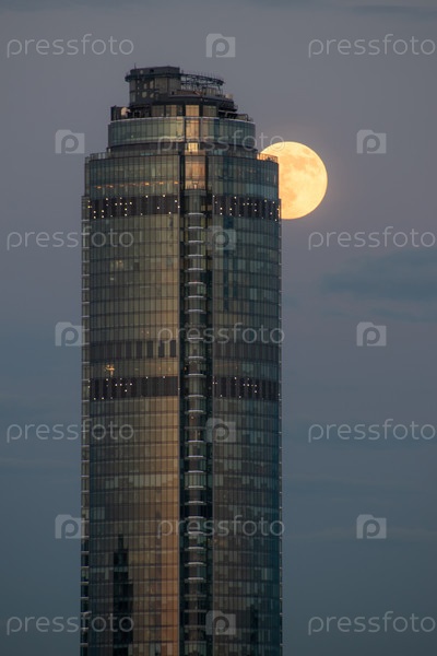 Полная луна прячется за небоскребом в городе Екатеринбурге