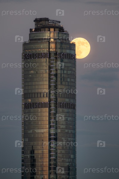 Полная луна прячется за небоскребом в городе Екатеринбурге