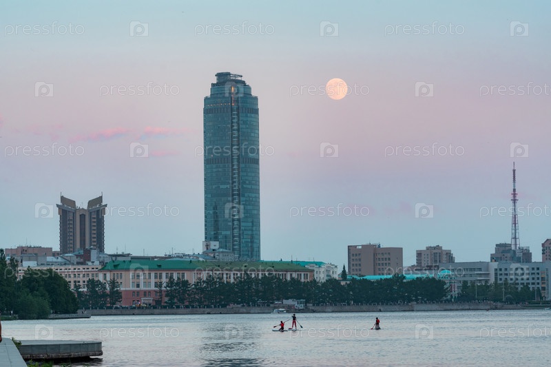 Полная луна над небоскребом в городе Екатеринбурге