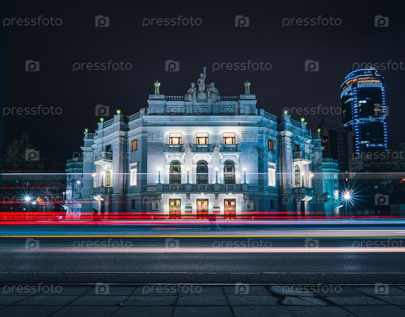 Огни проезжающих машин перед екатеринбургским театром оперы и балета ночью