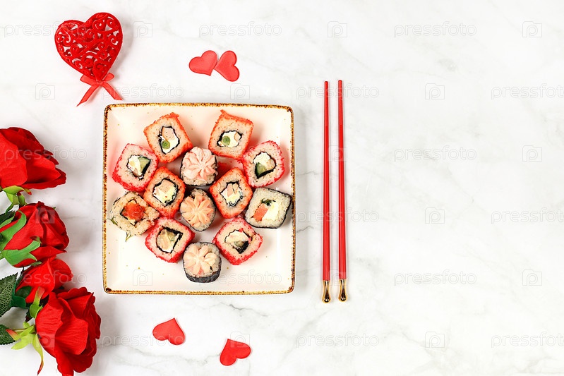 Еда ко Дню святого Валентина, Сердце свежих суши-роллов с розами, традиционная японская кухня, баннер для рекламы или пригласительный бар, меню, место для текста, вид сверху, выборочный фокус