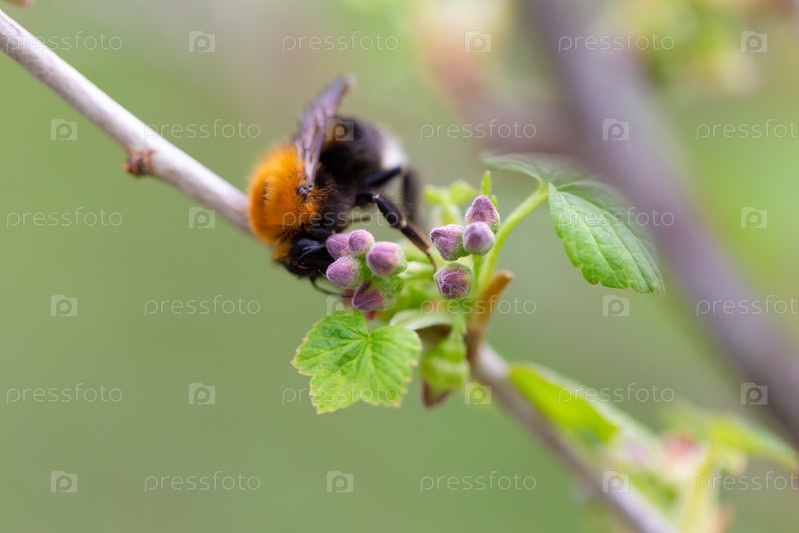 Шмель на ветке черной смородины весной