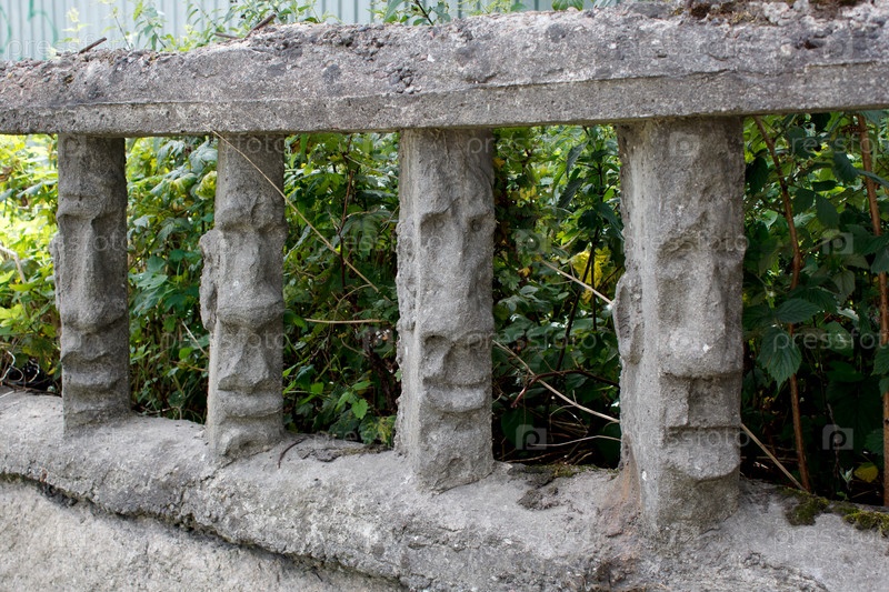 Каменный забор с человеческими лицами в солнечный летний день