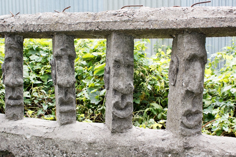 Каменный забор с человеческими лицами в солнечный летний день