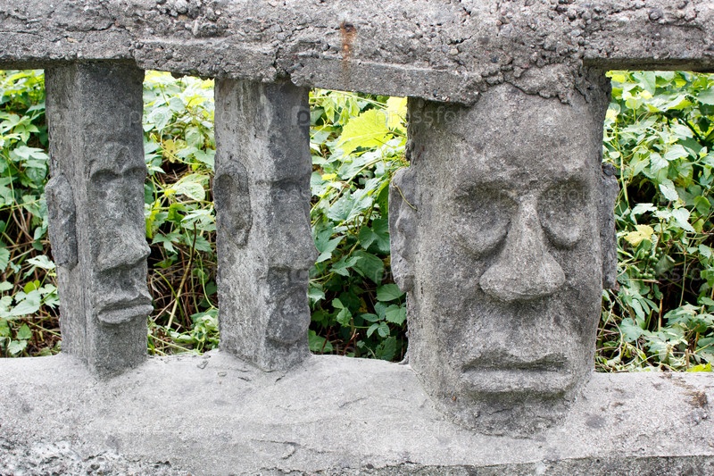 Каменный забор с человеческими лицами в солнечный летний день