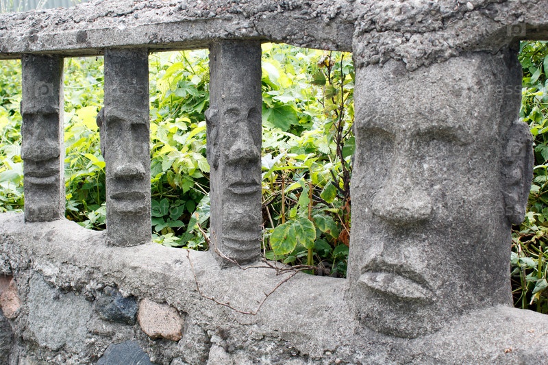 Каменный забор с человеческими лицами в солнечный летний день