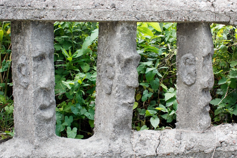 Каменный забор с человеческими лицами в солнечный летний день