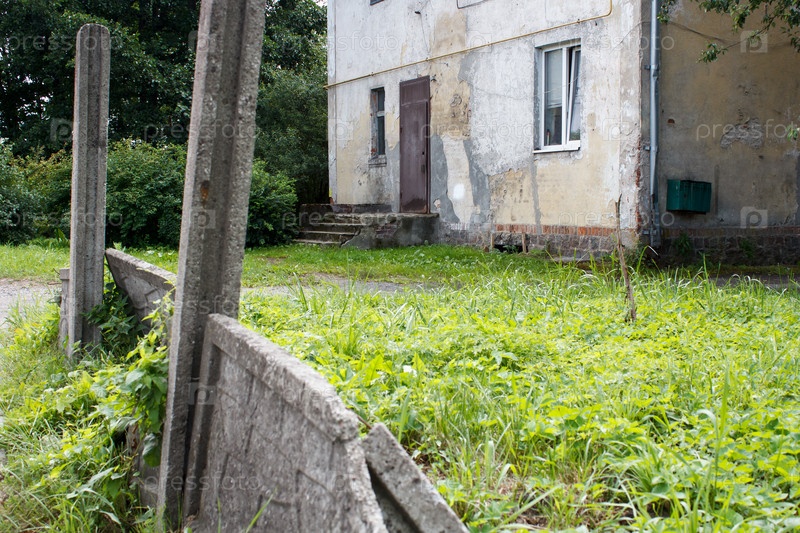 Старый шаткий бетонный забор возле старого дома на городской улице летом