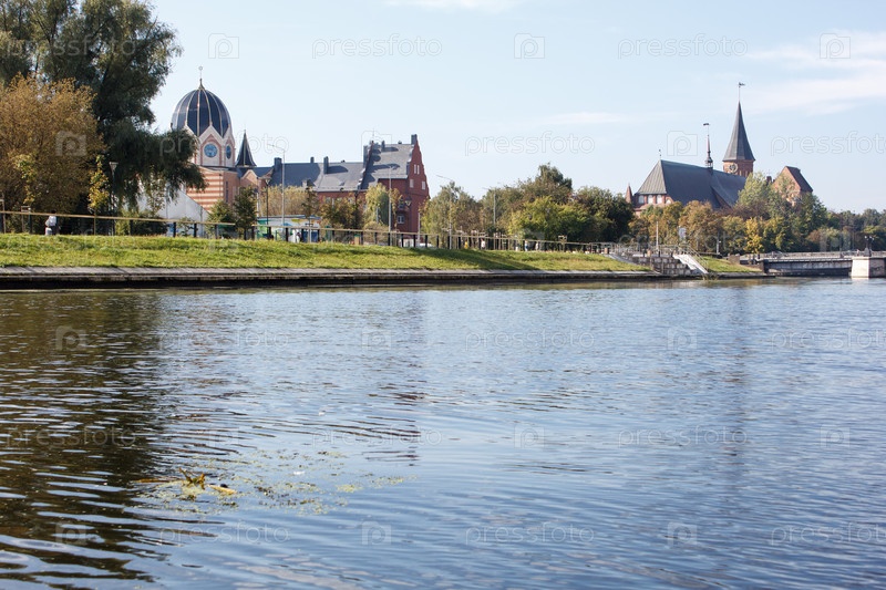 Вид с реки на синагогу и собор в солнечный летний день